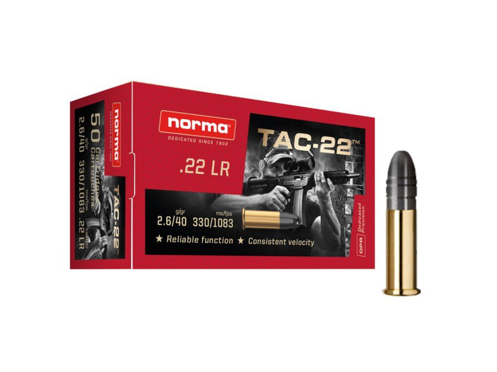 Velmi přesný malorážkový náboj Norma 22 LR Tac-22 je vhodný pro lovecké i sportovní účely. Osvědčil se i v samonabíjecích zbraních. Vyznačuje se absolutní jistotou funkce a precizními parametry, jako je přesnost a balistika.ráže: .22 LR