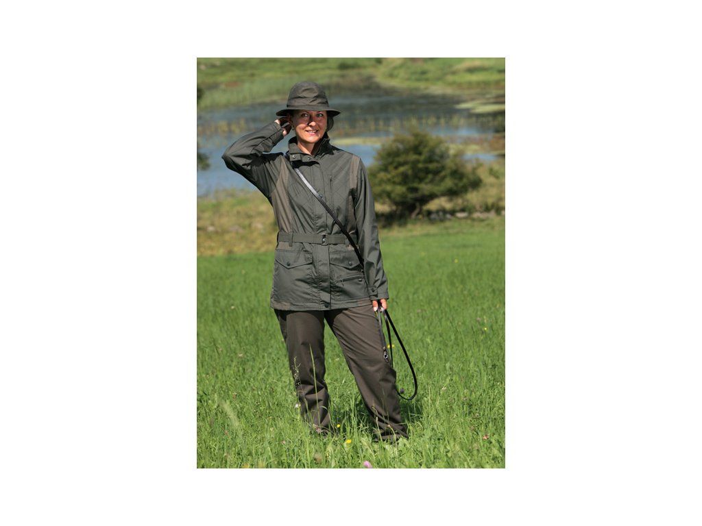Elegantní dámská bunda s ozdobně prošívaným předním dílem, v pase má bunda poutka a pásek s kovovou přezkou, díly na bocích jsou z materiálu CHERIS v šedozelené barvě, dvě spodní kapsy s patkami, na levé kapse je našita malá kapsa na zip, jedna nápsrsní kapsa zapínaná na zip a jedna vnitřní náprsní kapsa, hlavní zip bundy je krytý légou s druky, okraje rukávů jsou stahovány patkami s drukyMateriál: CHERIS - kvalitní pevná tkanina s lehce broušeným povrchem, plátnová vazba, vodoodpudivá úprava materiálu