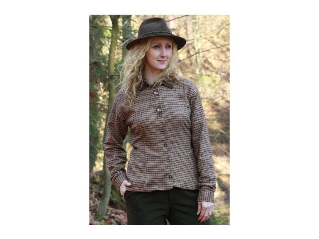 Dámská flanelová košile se záševky na předním i zadním dílle lichotí postavě. Léga je zdobená jemnou výšivkou protěže. Límeček zdobí aplikace z jednobarevné látky. Knoflíky jsou imitací parohu.barva: hnědá