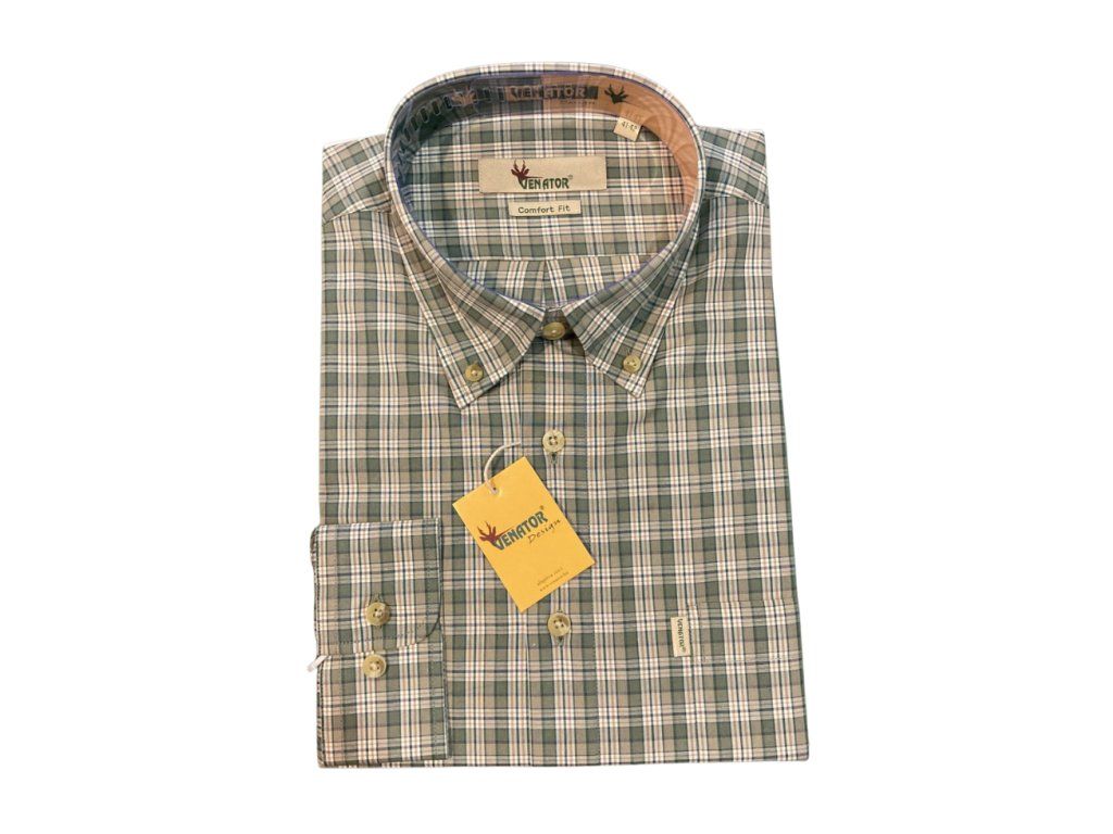 Bavlněná pánská košile Venator s dlouhým rukávem pohodlného střihu Comfort.Zeleno-bílý proužek je kombinován s jemnými okrovými linkami podélně i příčně. Knoflíky jsou béžové - žíhané. Na košili je jedna náprsní kapsa bez knoflíku. Spodní okraj košile je zaoblený.
