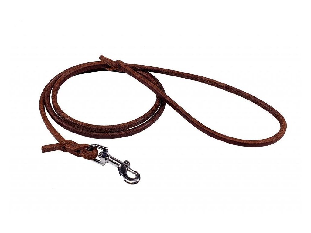 Kožené vodítko do ruky s hákovou karabinou, vyrobené z pevné mašťené kulaté kůže. Délka vodítka je 120 cm + 5.5 cm karabina. Spoje v uchu i hákové karabiny jsou napevno propleteny.materiál: hovězí kůže