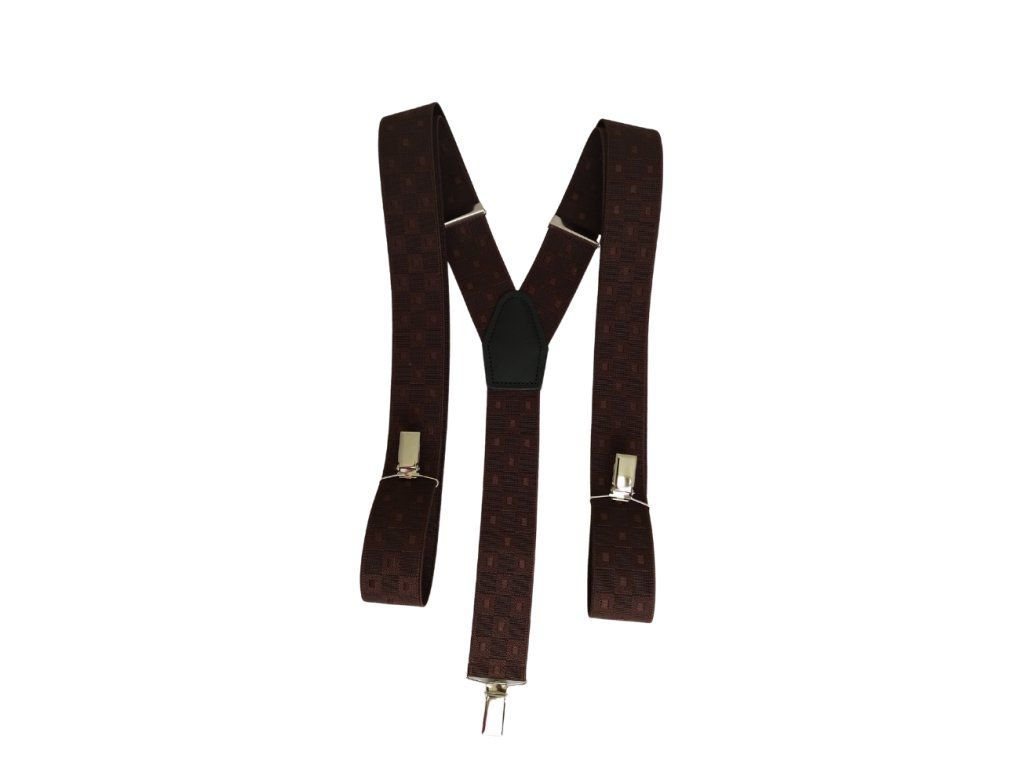 Jednobarevné hnědé šle s elegantním plastickým motivem.Čtverce a menší čtverečky vytvořené rozdílnými vzory tkaní vytváří zajímavý plastický efekt a šle tak získávají luxusní nevtíravý design.