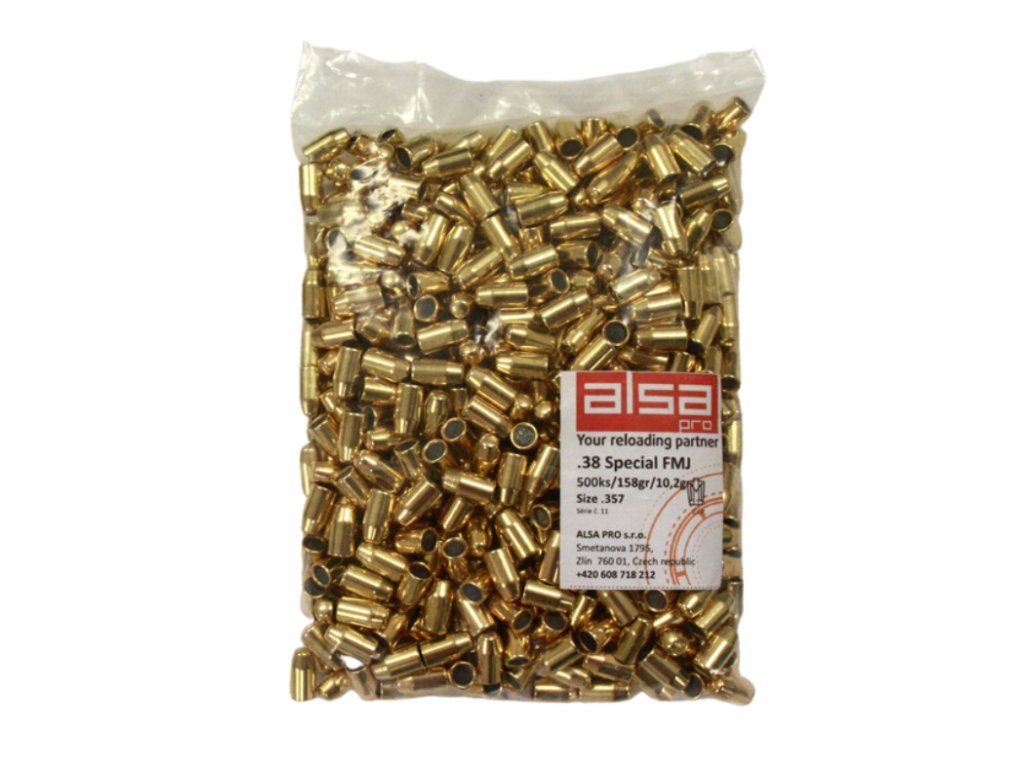 Střela .38 FMJ Alsa Pro se skládá z olověného jádra a mosazného pláště CuZn30 non-magnetic.hmotnost: 10,2 g / 158 gr
