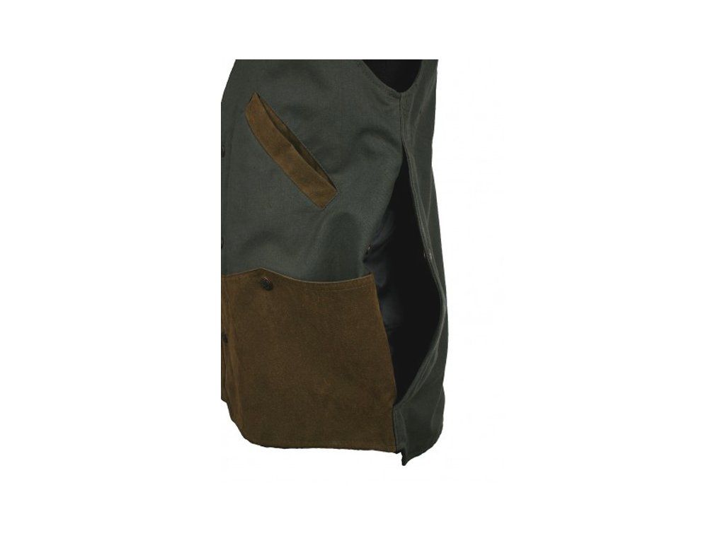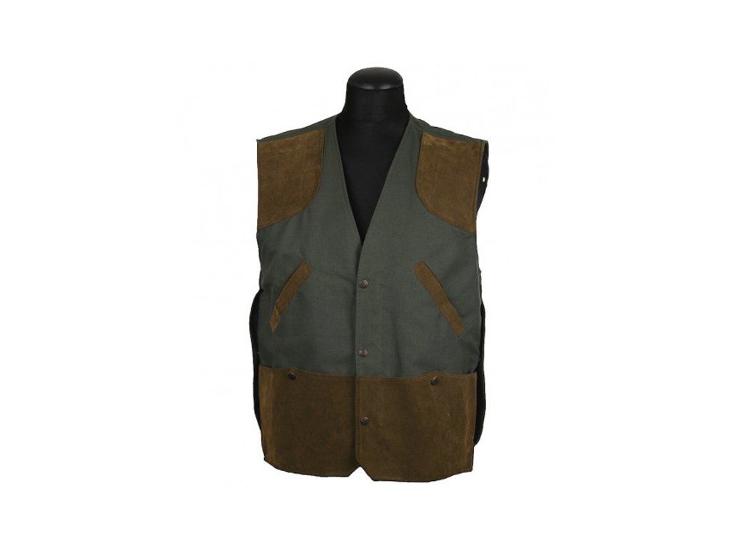 Lovecká vesta zdobená doplňky z hnědé umělé kůže. Na zadním díle je praktická zádová kapsa. Na předním díle jsou dvě průhmatové kapsy a dvě větší kapsy na patrony. Na boku lze pro větší pohodlí a volnější pohyb vestu rozepnout díky patentu. Materíál je ošetřen vododpudivou Teflonovou úpravou, která umožňuje i snadnější čištění.materiál: vrchní část - 100% bavlněný twil
