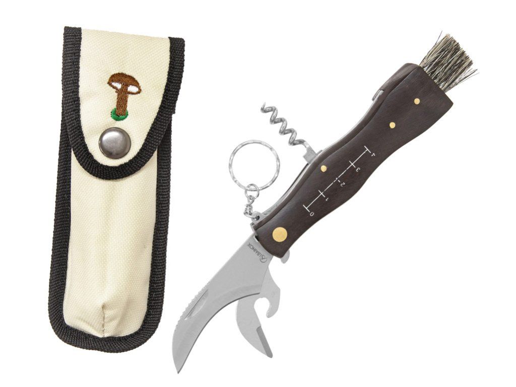 Multifunkční zavírací houbařský nůž Albainox 10592 se zahnutou čepelí, štětečkem, vývrtkou, otvírákem na lahve a konzervy, pinzetou a pouzdrem.Nůž má zahnutou hlavní čepel z nerezové oceli, pro snadné opracování hub a štěteček na čištění.